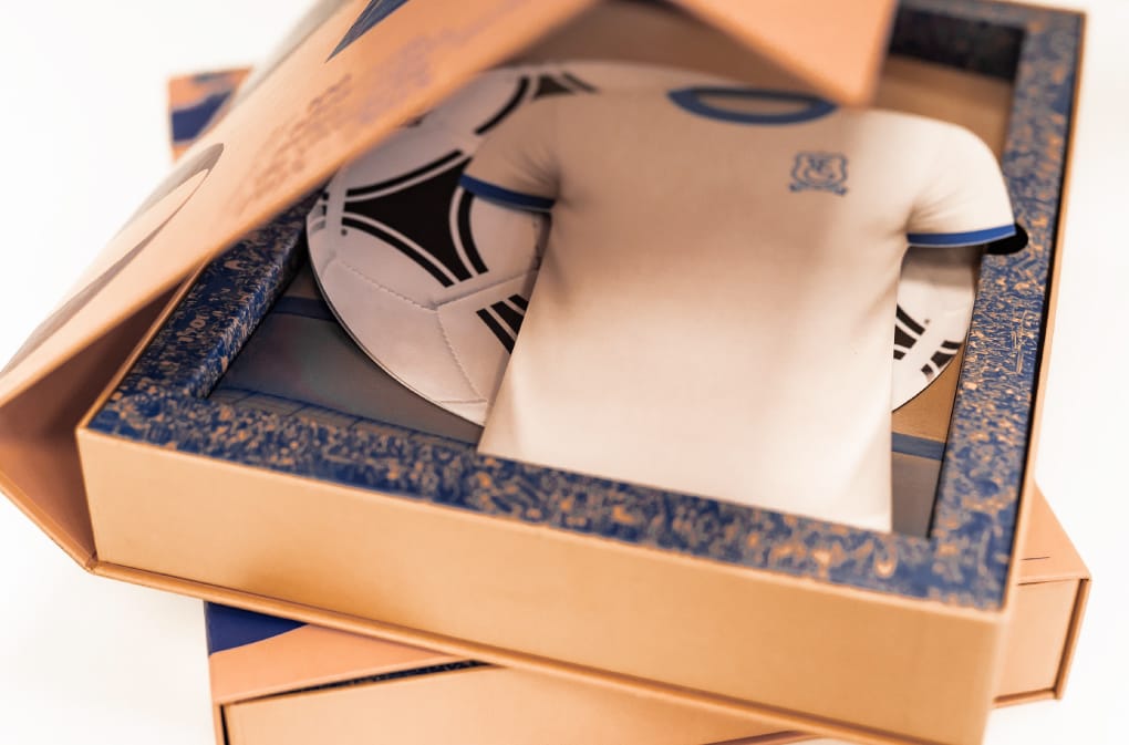 Desde nuestro lado, nos encargamos del diseño y conceptualización integral del proyecto, comenzando por la caja contenedora del pack conmemorativo, concebida como un elemento narrativo en sí mismo. La caja se diseñó con un fondo que evocaba un campo de fútbol, desde el que se podían distinguir las gradas del antiguo campo de Atocha, estableciendo un vínculo directo con la memoria histórica del fútbol guipuzcoano.