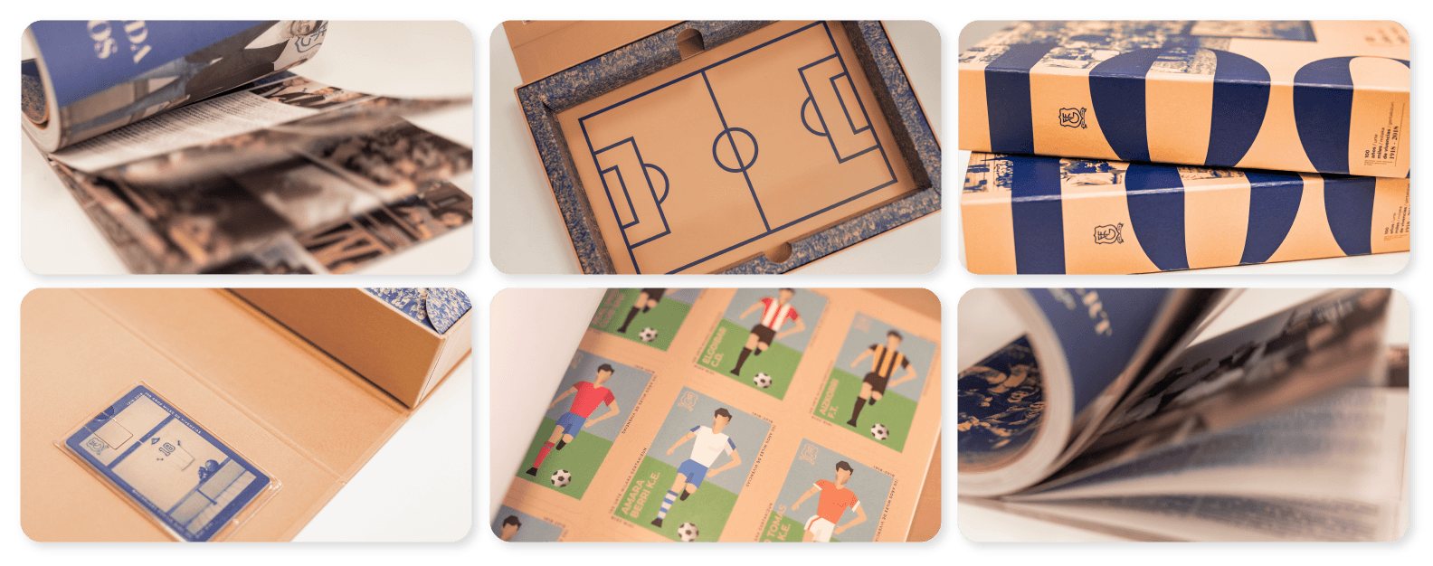 Además, diseñamos las equipaciones, los propios cromos, un USB con forma de cromo que incluía todo el contenido digitalizado, así como una serie de pósters conmemorativos del centenario, todos ellos integrados dentro del mismo universo gráfico y conceptual.