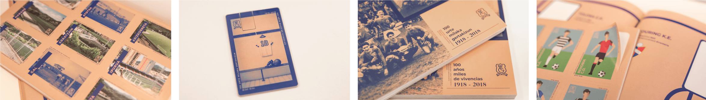 El proyecto se amplió con el diseño de un álbum de cromos conmemorativo, inspirado en los álbumes clásicos, que recogía los campos y los equipos de todas las entidades que conforman la Federación Guipuzcoana de Fútbol. Diseñamos tanto el álbum como los cromos, concebidos como pegatinas, y el sistema de retícula para su colocación, reforzando el carácter nostálgico y coleccionable del conjunto.
